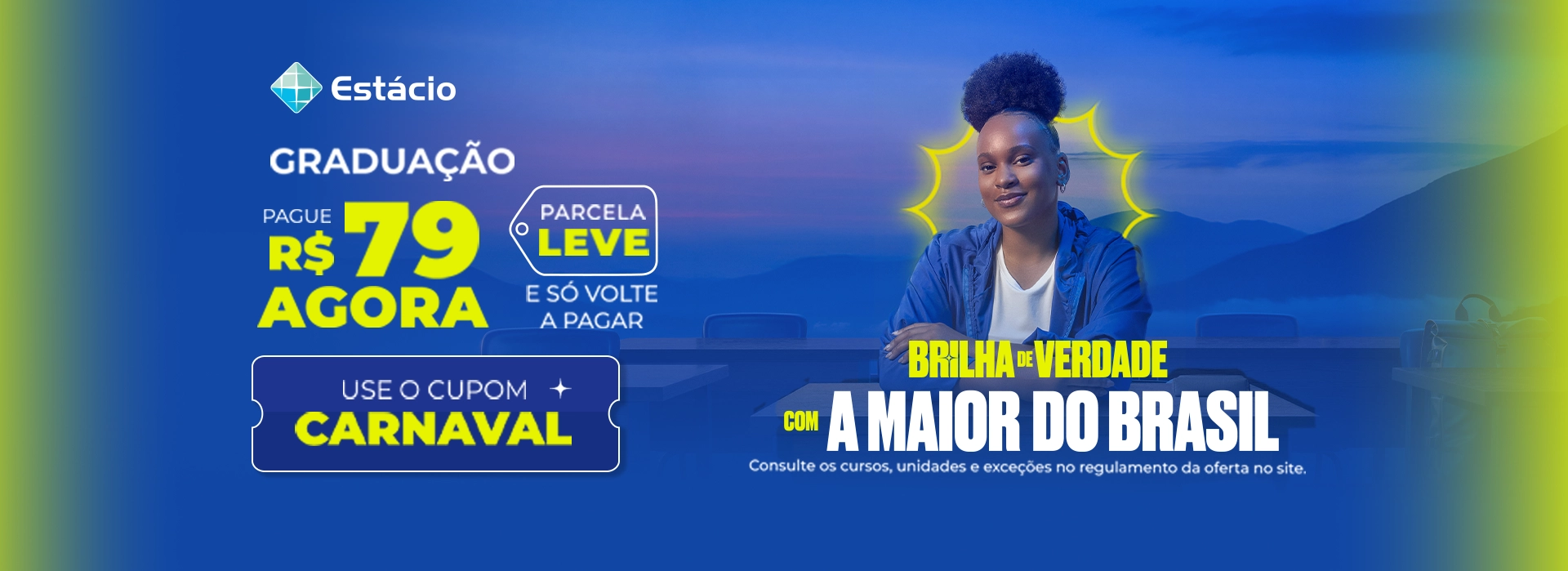 Uma forma de pagamento da Estácio em que você paga apenas R$79,00 na mensalidade dos 3 primeiros meses de curso. A diferença do valor total das mensalidades é diluída ao longo de todos os meses da graduação.